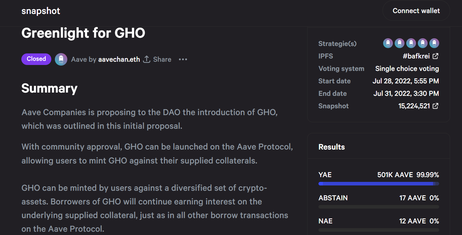 The Aave company put up the GHO creation proposal on July 28, which received an overwhelming 99.9% community vote over the course of three days. The proposal ended on Jul 31 at 10:00 am GMT with 501,000 AAVE tokens pledged in favor of creating the crypto-collateral backed stablecoin.