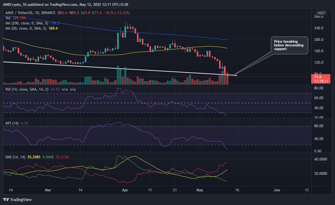 It has been heavily bearish in the last 7 days courtesy of the shaky and FUD-filled market conditions. Despite the slight recovery from the recent low, AAVE is still down by roughly 54% in the last seven days, and by 72% from its latest local top on 1 April.