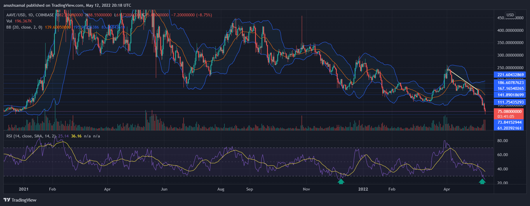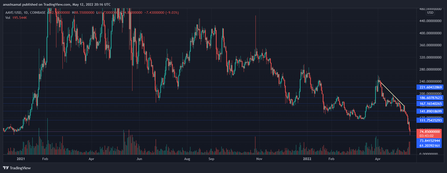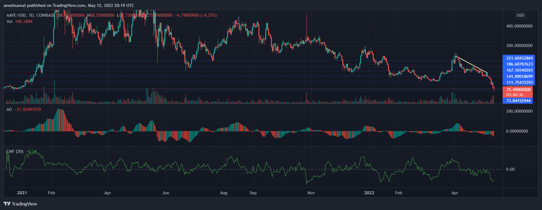 Aave has been on a downtrend since April amidst intense volatility in the market. Major altcoins have extended losses owing to a major sell off all across the cryptocurrency industry. Over the past week, the coin presented lower lows and displayed intense selling pressure.