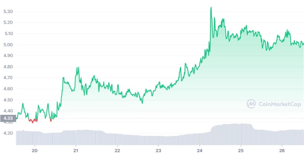 Mientras tanto, la última semana ha tenido un alza del 23% chiliz (CHZ). Este criptoactivo permite acceder a servicios exclusivos para fanáticos de varios clubs deportivos en la plataforma Socios.com.
