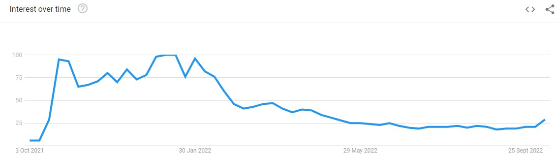 O primeiro ponto de escala que fui foi o Google, onde a análise de pesquisa mostra um grande aumento no interesse pelo termo “metaverso” depois que Zuck foi all-in em outubro passado. Não muito tempo depois, uma tendência de baixa constante.
