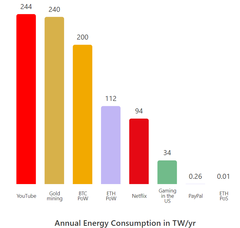 Antes de la actualización de Merge, en 2022, el consumo de energía de Ethereum oscilaba entre 46.31 teravatios hora (TWh) al año y 93.98 TWh al año. El consumo energético más bajo de Ethereum se registró el 26 de diciembre de 2019, con 4.75 TWh al año.