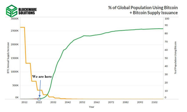 Utilizando la media y la media ponderada de las curvas históricas de adopción de tecnologías, así como la tasa de crecimiento de la adopción de bitcoin, el informe pudo llegar a su predicción.