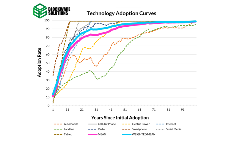 En su informe del miércoles, Blockware Intelligence dijo que llegó a esta previsión examinando las curvas de adopción históricas de nueve tecnologías innovadoras anteriores, como los automóviles, la energía eléctrica, los teléfonos inteligentes, Internet y las redes sociales, junto con la tasa de crecimiento de la adopción de bitcoin desde 2009: