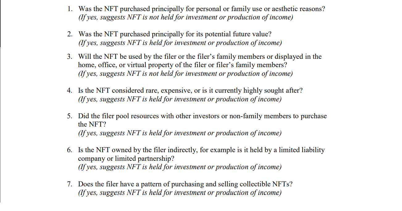 En la asesoría legal presentada a los funcionarios de ética designados por la agencia, el director Emory Rounds III dijo que todas las inversiones en NFT —tanto los fraccionados (F-NFT) como los coleccionables— por valor de 1,000 dólares deben ser declaradas si "se mantienen para inversión o producción de ingresos" al final del periodo de declaración.