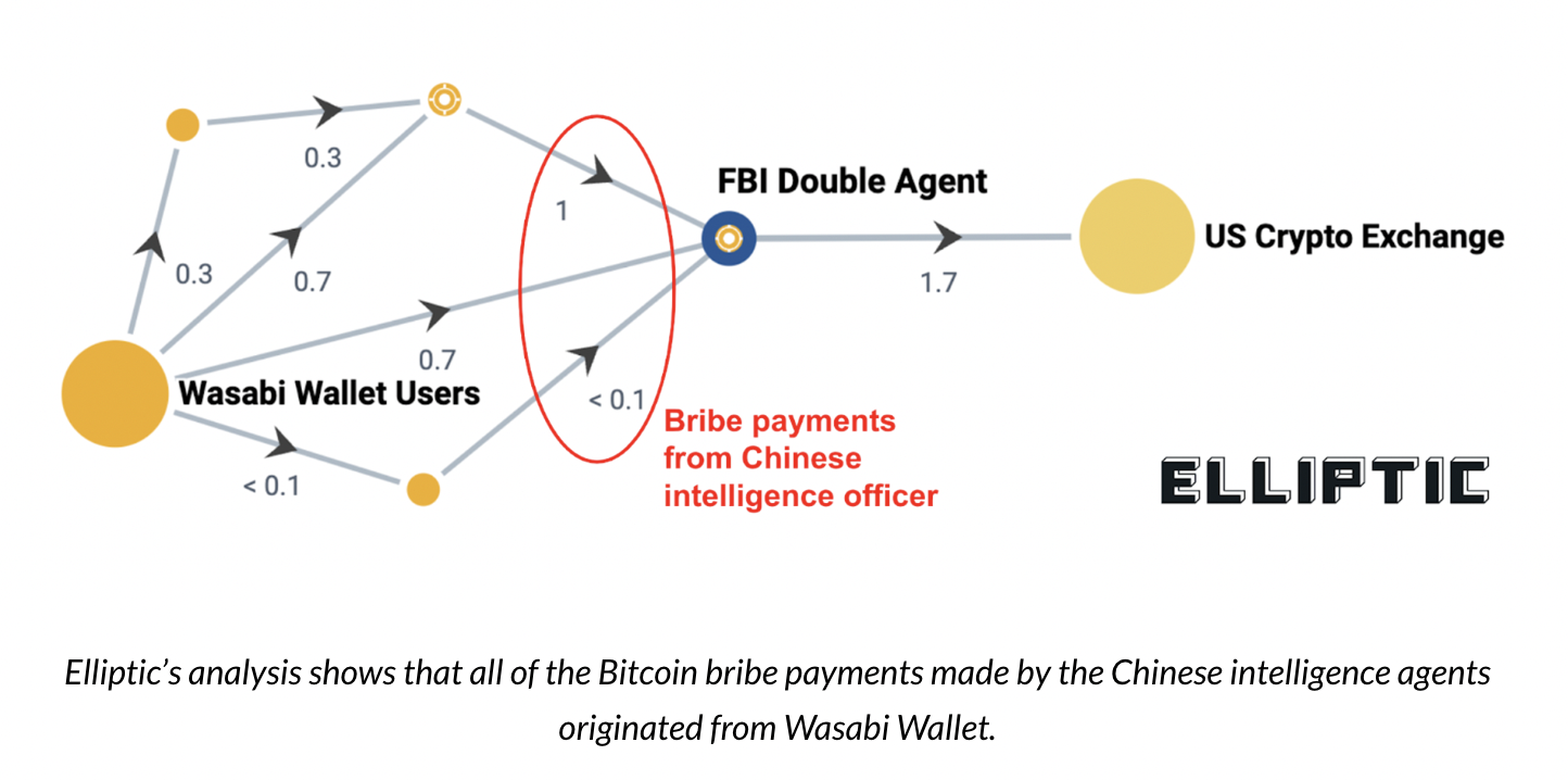 De acordo com uma análise da empresa de gerenciamento de risco de criptomoedas Elliptic, He e Wang usaram a Wasabi Wallet para ocultar as transações de BTC supostamente usadas no suborno. A empresa informou que a carteira de privacidade havia sido usada anteriormente em uma tentativa de lavar BTCs do hack do Twitter de julho de 2020 e dos ataques às exchanges de criptomoedas Bitfinex em 2016 e KuCoin em 2020.