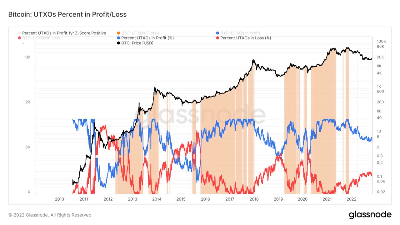 Sin embargo, los datos adicionales sobre las salidas de transacciones no gastadas (UTXO) muestran que los niveles actuales de BTC que se mueven en la cadena con pérdidas no coinciden con los mínimos históricos del mercado bajista.