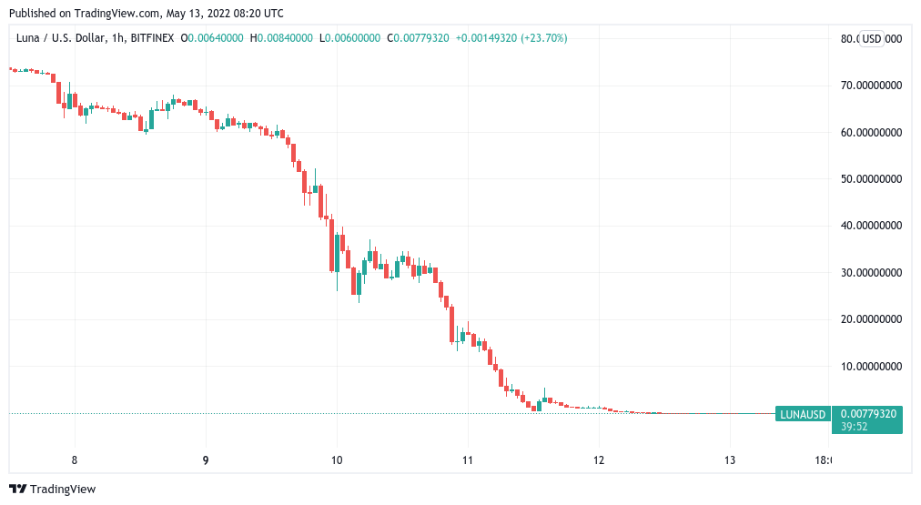 El par LUNA/USD, después de haber sido retirado del gran exchange Binance, cotizaba a USD 0.0077 en Bitfinex en el momento de escribir este artículo, según datos de Cointelegraph Markets Pro y TradingView.