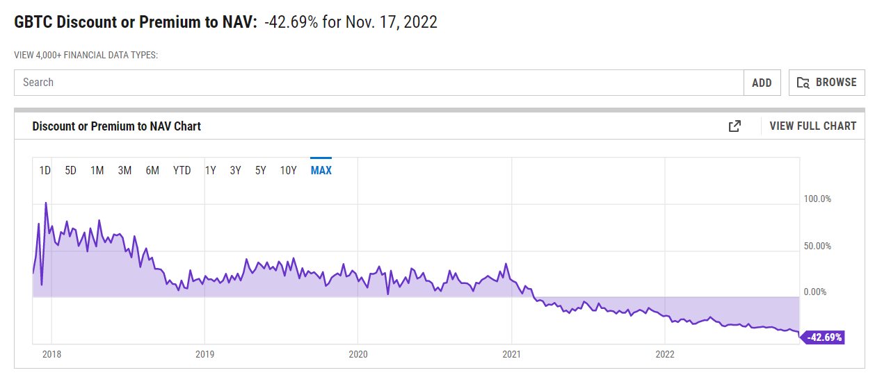 Согласно данным yCharts, скидка биткоин-траста (GBTC) от Grayscale Investments относительно стоимости самого биткоина упала на 42,69%, что является рекордным минимальным значением за всю историю существования фонда. Это больше чем скидка в сентябре 2022 года, когда она составила 35,18:
