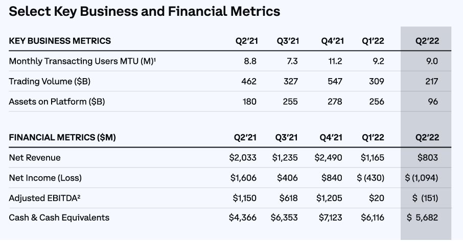 Чистая выручка во втором квартале 2022 года упала до $803 млн (около 82% пришлось на торговые комиссии), против $2,03 млрд в прошлом году. Также снизился и объем торгов — $462 млрд во втором квартале 2021 года до $217 млрд в этом. В компании объяснили падение показателей снижением цен на криптовалюты.