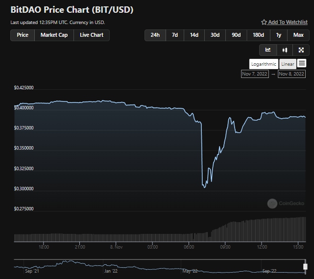 8 ноября цена FTT за несколько часов упала примерно на 30%. Одновременно с этим резко подешевел BIT — примерно с $0,4 до $0,3 (CoinGecko).