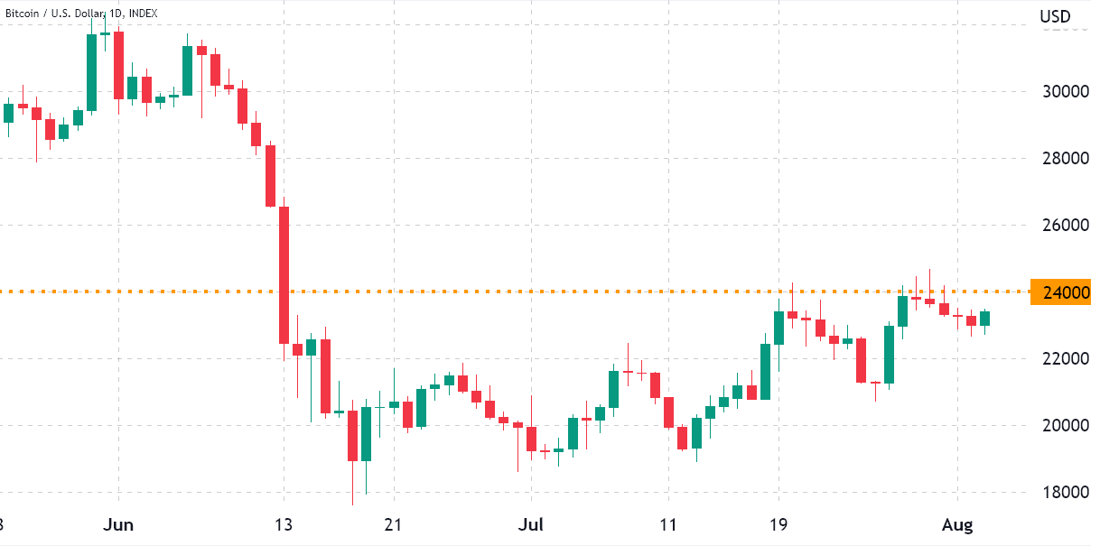 El escenario más probable es un empate, haciendo que el precio del Bitcoin oscile entre USD 22,000 y USD 24,000 antes del vencimiento de las opciones del 5 de agosto.
