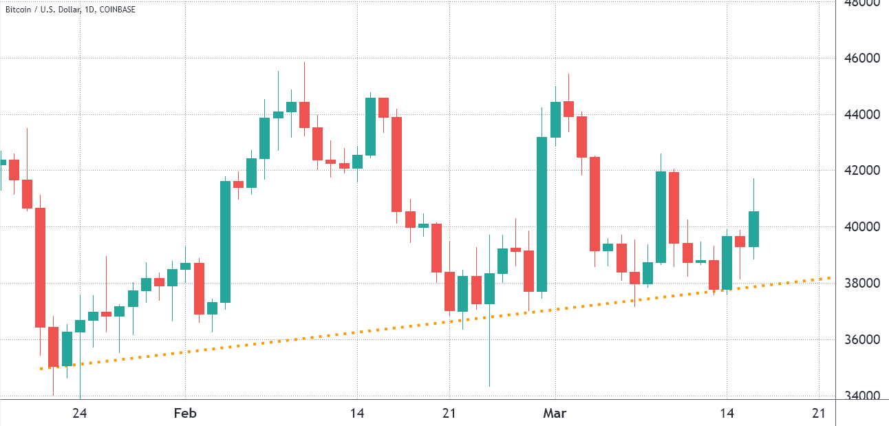Los alcistas de Bitcoin liquidaron posiciones largas de apalancamiento de USD 98 millones el 16 de marzo, por lo que hay menos incentivos para aumentar el precio a corto plazo. Dicho esto, es probable que los alcistas intenten defender el soporte de USD 40,000 hasta el vencimiento de las opciones del 18 de marzo.