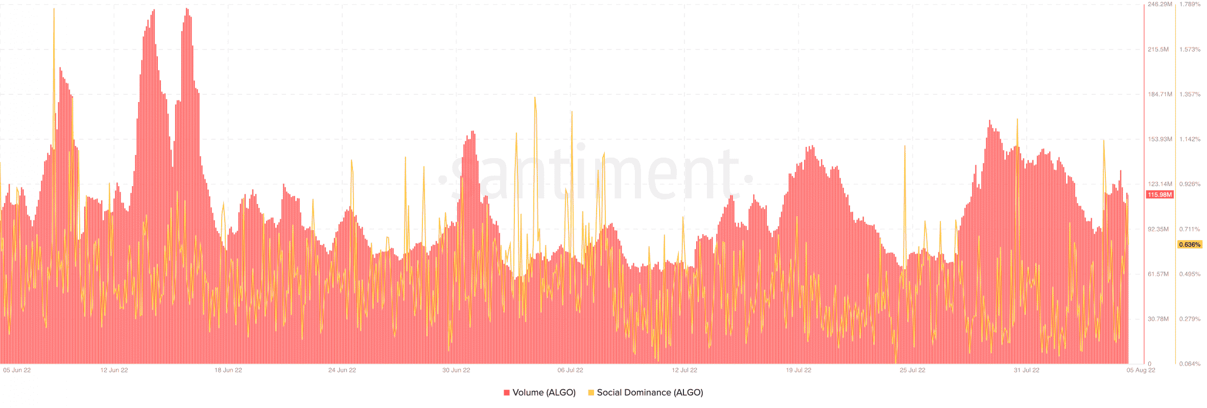 In fact, a look at Santiment revealed that ALGO’s volume has not reached anywhere near its June levels. Similarly, its social dominance has dwindled drastically too.