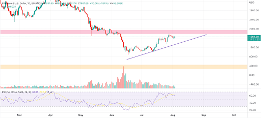 As seen in the chart, the ETH price is raising within an ascending parallel channel and very recently faced a rejection. Therefore, the ETH price may certainly not hit the lower support below $1500 but may make a strong rebound even if it slashes below $1600. Also, the RSI is also on a rise and hence the price may continue to coil up and achieve the required target at the earliest.
