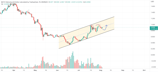 Polygon price is swinging within a pre-determined parallel channel and preparing to bounce off from the lower support. The asset has formed a bearish pattern and is hence expected to undergo a drain and hit $0.75. But the bulls appear to be strong and pulled the price from the bearish divergence.