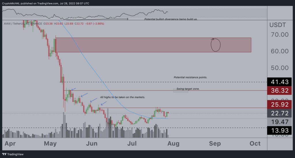 En el momento de la redacción de este artículo, AVAX se cotiza en USD 23,31. Van de Poppe señaló que un repunte de la demanda podría llevar a esta altcoin a superar los máximos ya logrados por encima de USD 26. El rango posible de precio para AVAX está entre USD 37 y USD 41, dice el especialista, lo cual representa entre 60% y 78% de repunte.