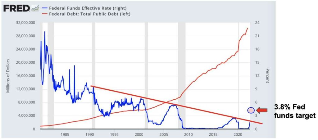 Como se aprecia en el gráfico, las tasas más altas, con un objetivo de alcanzar un 3,8%, rompen con su tendencia decreciente señalada por la línea roja. Heinrich sostiene: «Un incremento más de las tasas de interés y llegaremos o superaremos la tendencia de capitulación de la Fed, mientras que la siempre creciente deuda pública traerá una recesión y la Fed tendrá que intervenir para disminuir las tasas».