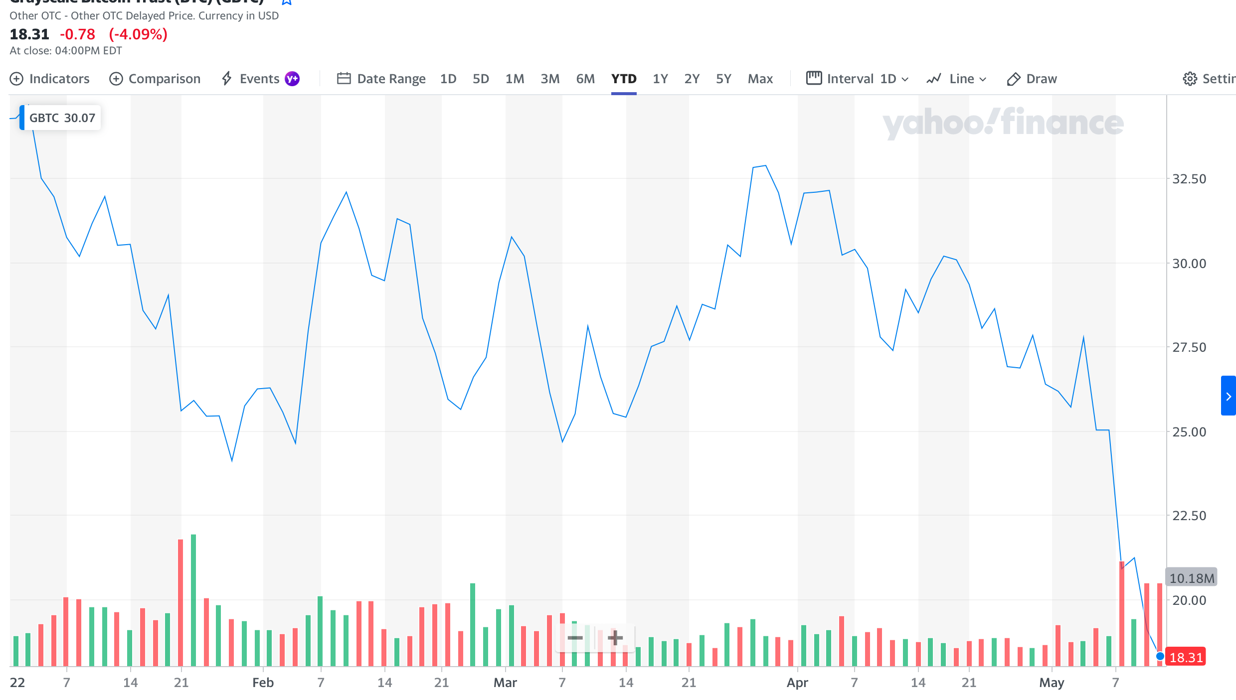 The negative premium of trust products such as Grayscale Bitcoin and Ethereum reached a record high as reported by Wu Blockchain. Grayscale Bitcoin Trust had a negative premium of 30.65%. The market price per share witnessed a similar fate as it fell to 18.31 as seen in the graph below.