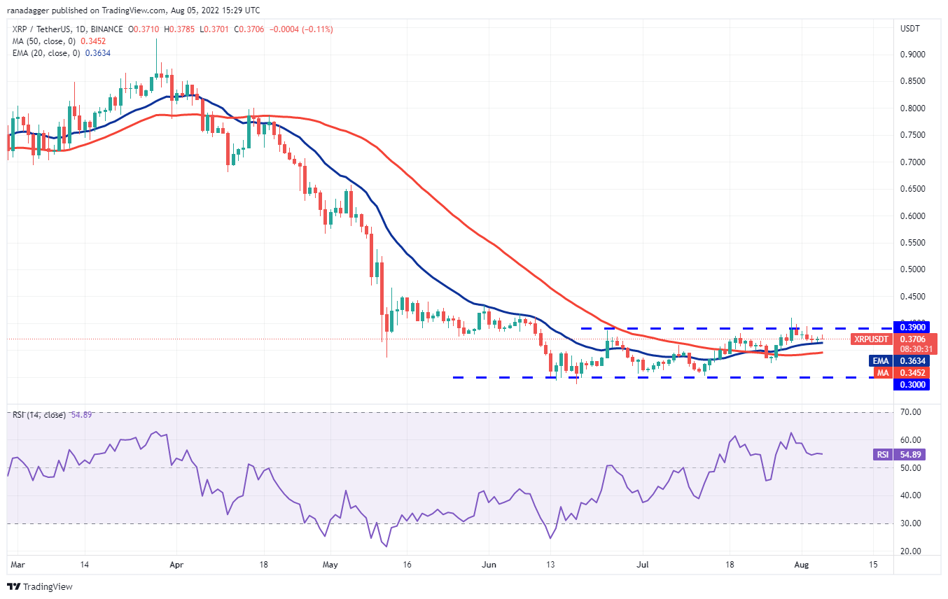 Os compradores mantiveram com sucesso o suporte da EMA de 20 dias (US$ 0,36) nos últimos dias, mas não conseguiram uma forte recuperação no XRP. Isso sugere que os ursos estão vendendo em altas.