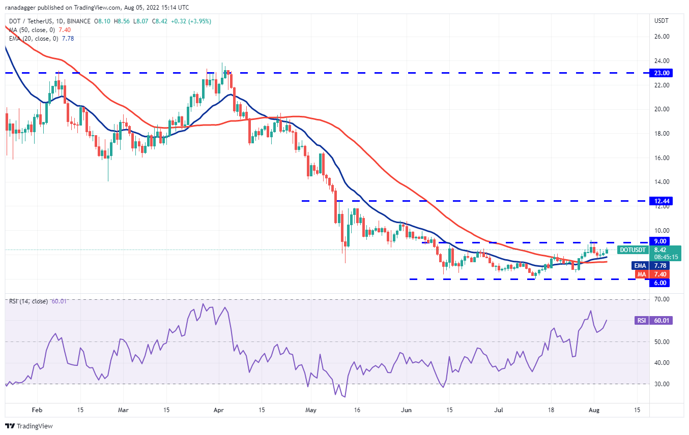 O Polkadot (DOT) recuperou a EMA de 20 dias (US$ 7,78) em 3 de agosto, indicando demanda em níveis mais baixos. Os compradores tentarão empurrar o preço para a zona de resistência aérea entre US$ 9 e US$ 9,21.