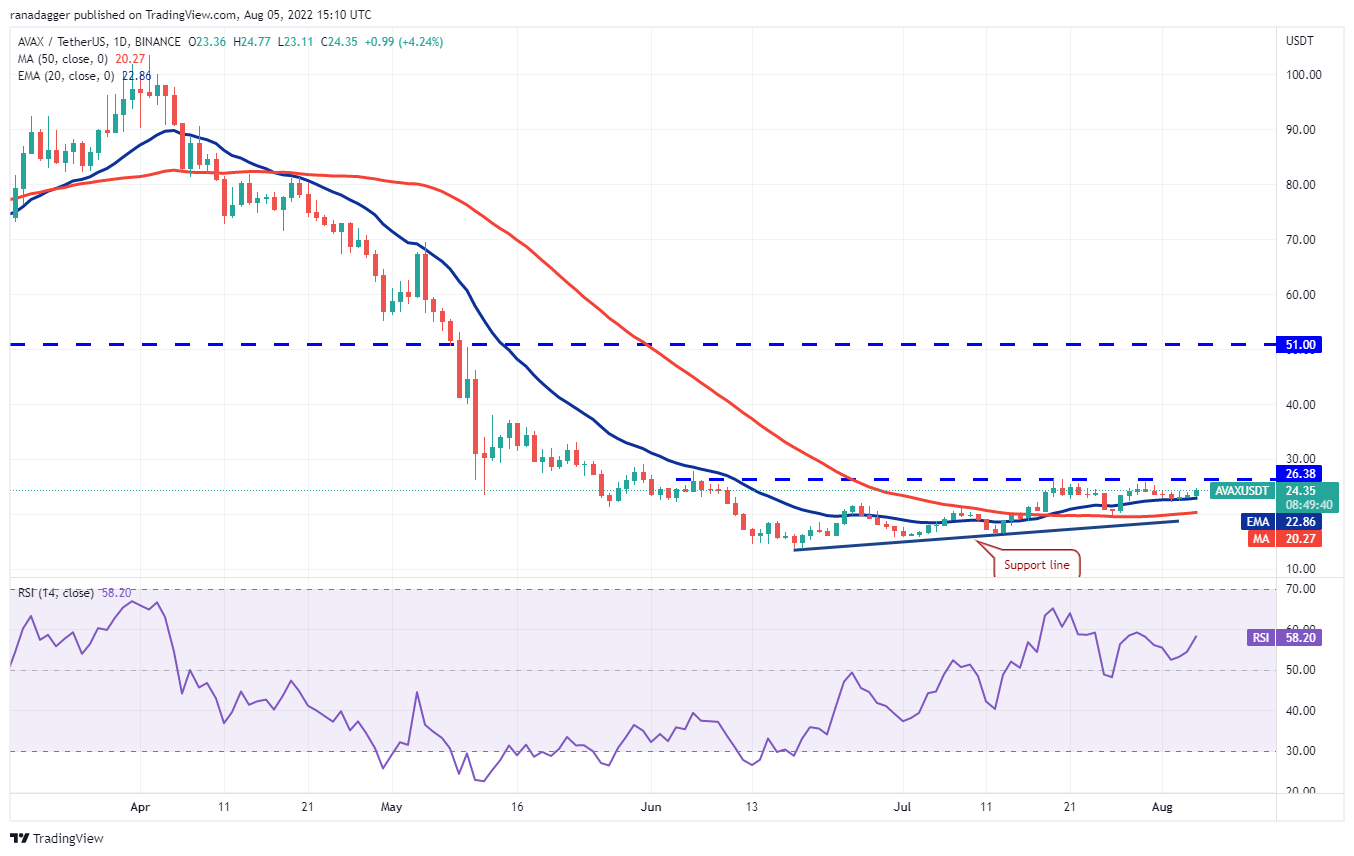 Avalanche (AVAX) saltou da EMA de 20 dias (US$ 22,86), indicando que os touros estão comprando as quedas para esse suporte.