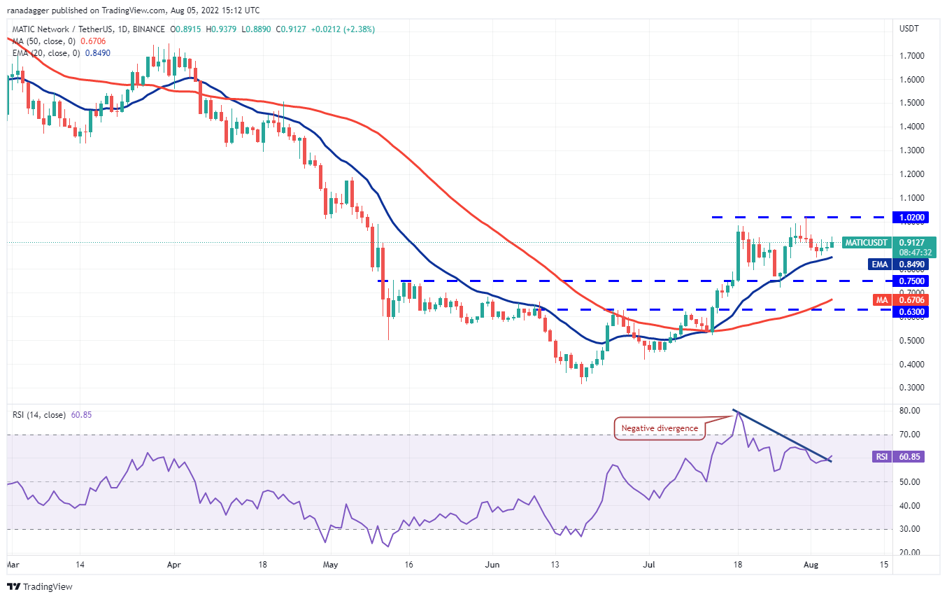 Os compradores mantiveram com sucesso o Polygon (MATIC) acima da EMA de 20 dias (US$ 0,85) durante a correção, o que sugere uma mudança no sentimento de vender em altas para comprar em baixas.