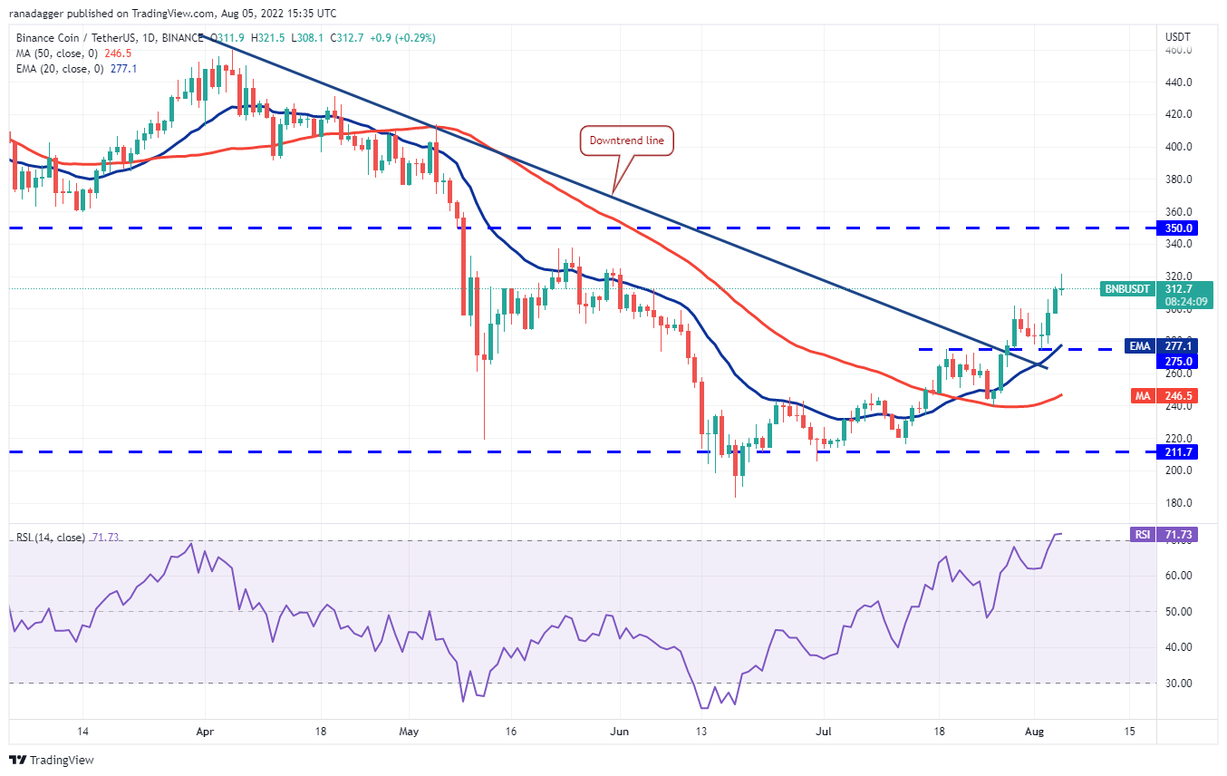 A EMA de 20 dias com inclinação ascendente (US$ 277) e o RSI na zona de sobrecompra indicam que os touros estão no comando. O par BNB/USDT pode subir para a forte resistência aérea em US$ 350. Esse nível provavelmente atrairá fortes vendas dos ursos.