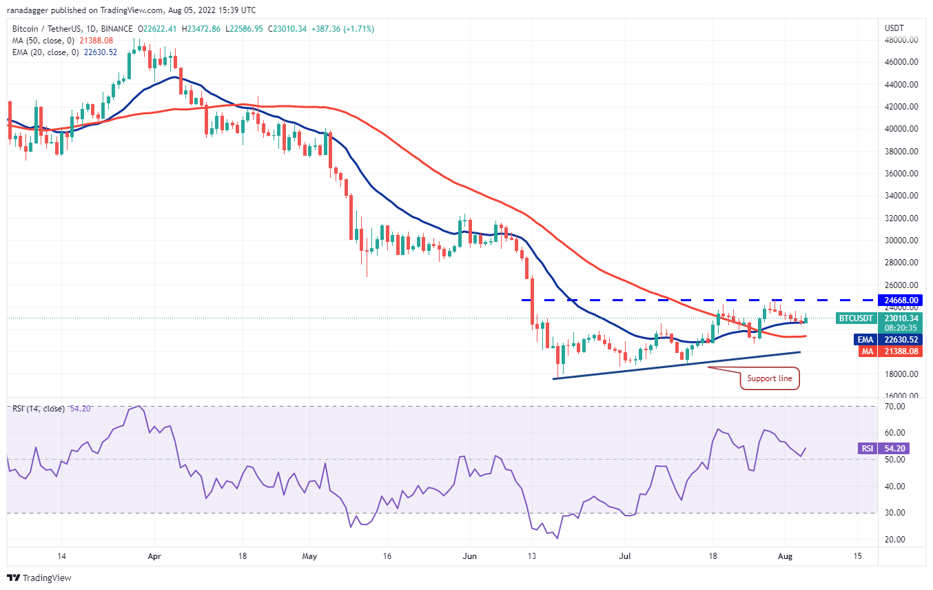 Os ursos puxaram o preço abaixo da média móvel exponencial de 20 dias (EMA) (US$ 22.630) em 4 de agosto, mas não conseguiram sustentar os níveis mais baixos. Isso indica que os touros estão defendendo o nível agressivamente.