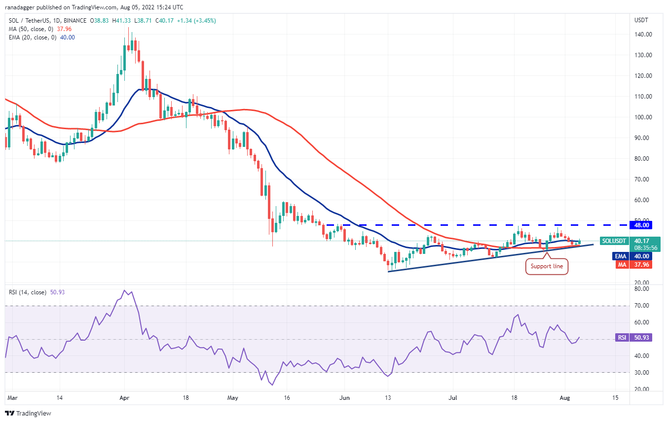 Os ursos tentaram baixar o preço abaixo da linha de suporte em 3 de agosto, mas os touros defenderam o nível com sucesso. Solana (SOL) formou um padrão de velas de dia interno em 4 de agosto, que resolveu para cima em 5 de agosto.