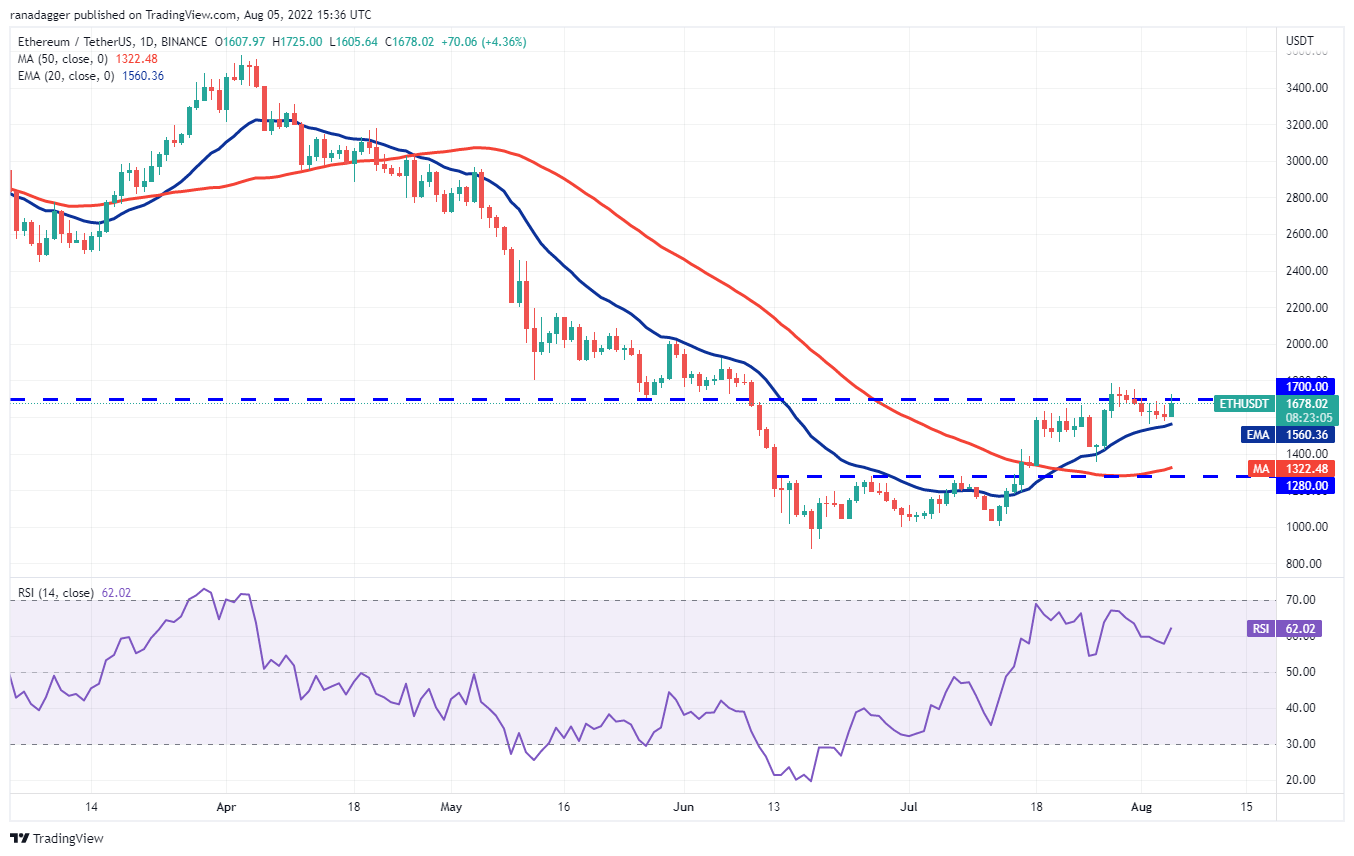 O Ether (ETH) tem sido negociado entre a EMA de 20 dias (US$ 1.560) e a resistência de US$ 1.700 nos últimos quatro dias. Normalmente, a negociação de intervalo apertado é seguida por uma expansão de intervalo.
