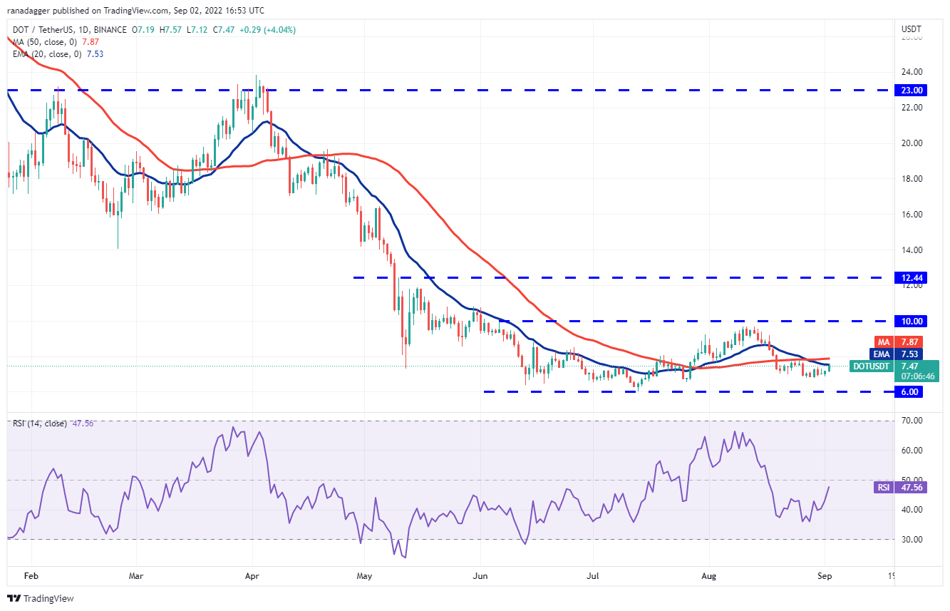 Esse saldo pode inclinar a favor dos compradores se eles empurrarem e sustentarem o preço acima da zona aérea entre US$ 7,38 e a SMA de 50 dias (US$ 7,87). O par DOT/USDT poderia então iniciar um rali para US$ 9,17 e depois para a resistência de sobrecarga em US$ 10.