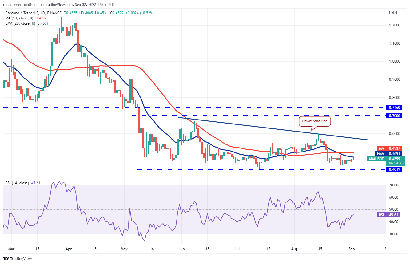 Cardano (ADA) tem negociado perto da EMA de 20 dias (US$ 0,47) nos últimos três dias, mas os touros não conseguiram elevar o preço acima dela. Isso sugere que os ursos estão defendendo a EMA de 20 dias, mas um ponto positivo menor é que os touros não desistiram de muito terreno.