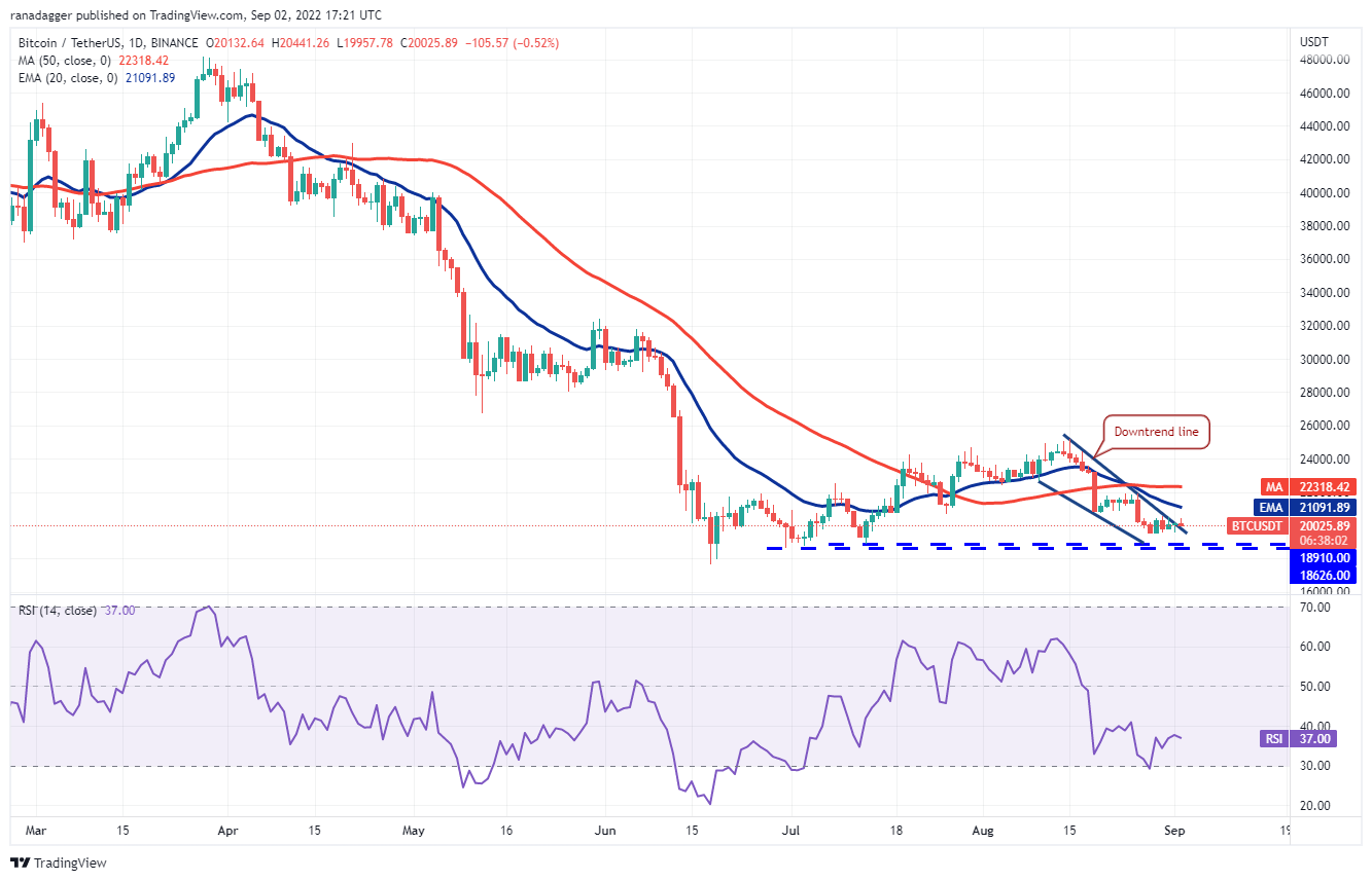 Este é um nível importante a ser observado, porque se os compradores superarem esse obstáculo, isso sugerirá que o sentimento negativo pode estar enfraquecendo. O par BTC/USDT poderia então tentar um rali para a média móvel simples de 50 dias (SMA) (US$ 22.318).