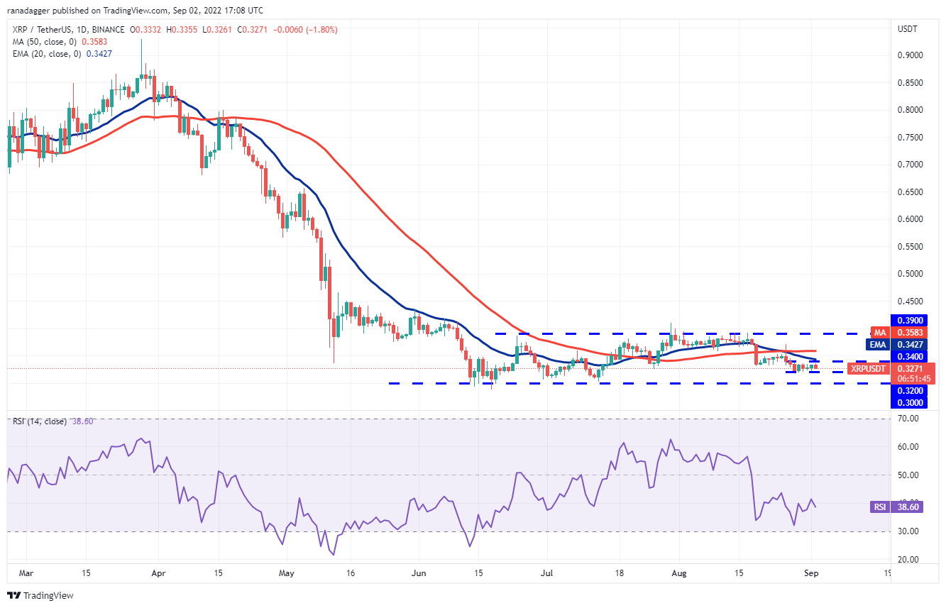 A EMA de 20 dias descendente (US$ 0,34) e o RSI abaixo de 39 sugerem que os ursos estão em vantagem. Se o preço cair e romper abaixo de US$ 0,32, o par XRP/USDT pode cair para o importante suporte em US$ 0,30. Se este nível também ceder, o par poderá iniciar a próxima perna da tendência de baixa.