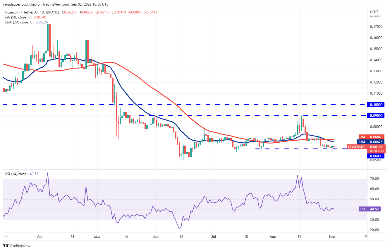 Dogecoin (DOGE) mais uma vez recuperou o forte suporte em US$ 0,06 em 1º de setembro, mas a recuperação não tem força. Isso sugere a ausência de compra agressiva nesses níveis.
