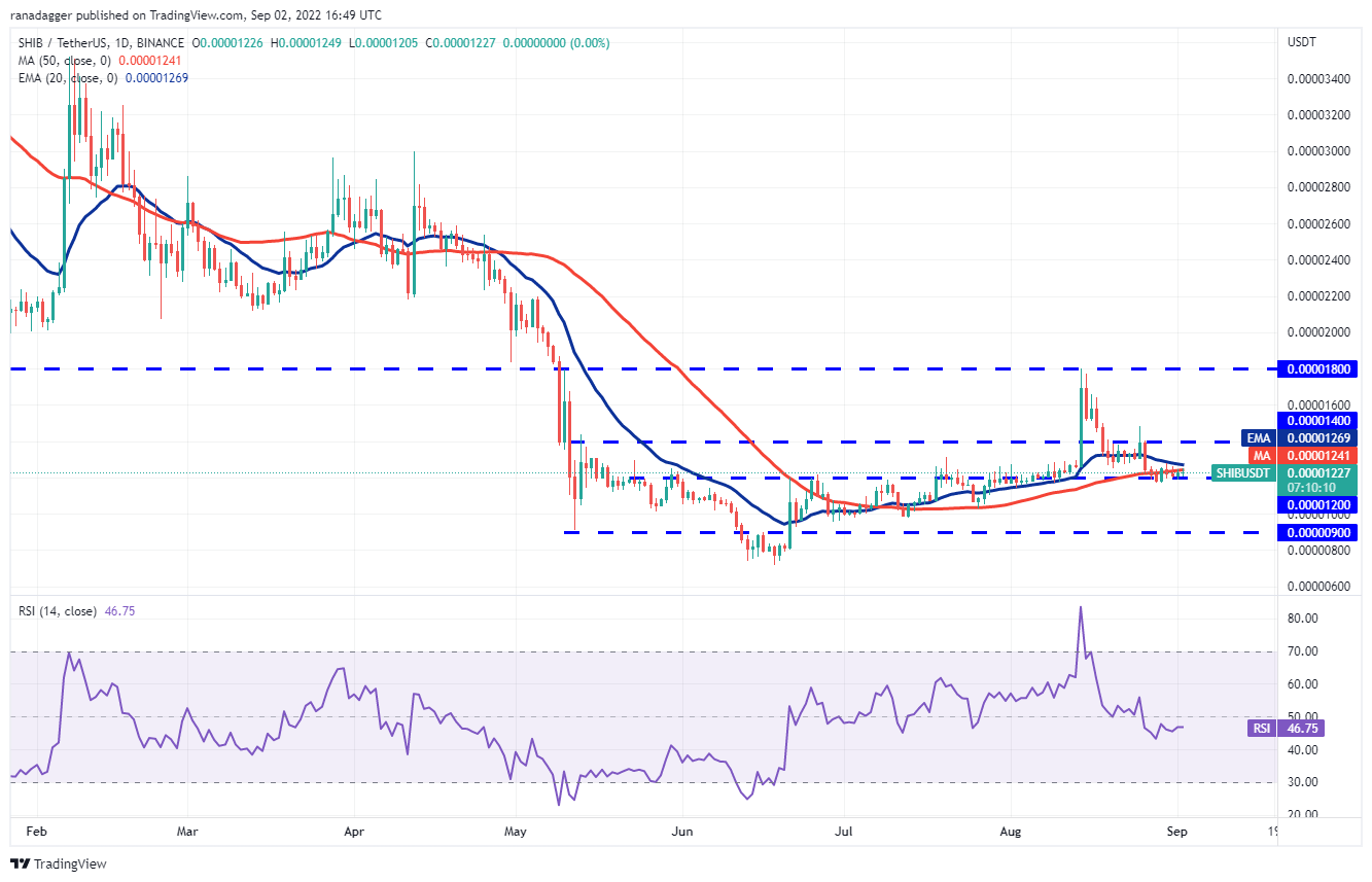 Shiba Inu (SHIB) recusou a EMA de 20 dias (US$ 0,000013) em 30 de agosto e caiu para o importante suporte em US$ 0,000012. Isso sugere que os ursos estão ativos em níveis mais altos.