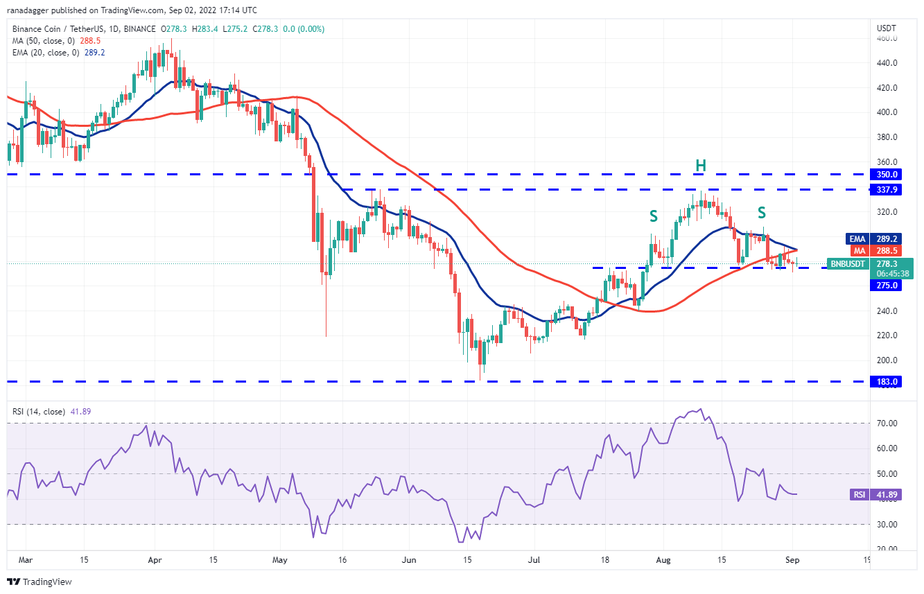 Binance coin (BNB) recusou a EMA de 20 dias (US$ 289) em 31 de agosto e caiu abaixo do forte suporte de US$ 275 em 1º de setembro. No entanto, a cauda longa no candle do dia mostra compras agressivas em níveis mais baixos.