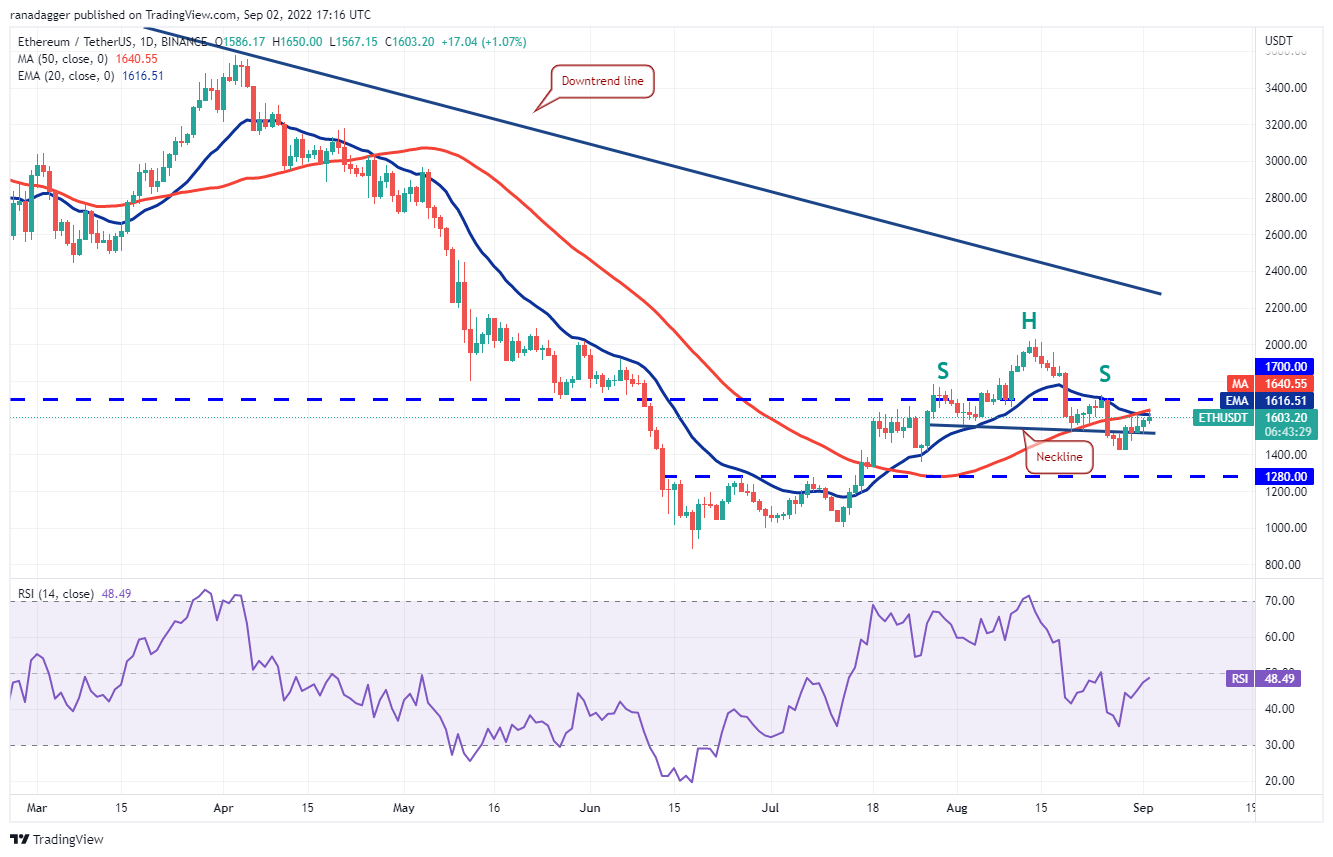 O Ether (ETH) caiu da EMA de 20 dias (US$ 1,61) em 31 de agosto, mas um sinal positivo é que os touros não permitiram que o preço caísse abaixo da linha de pescoço do padrão de cabeça e ombros (OCO).