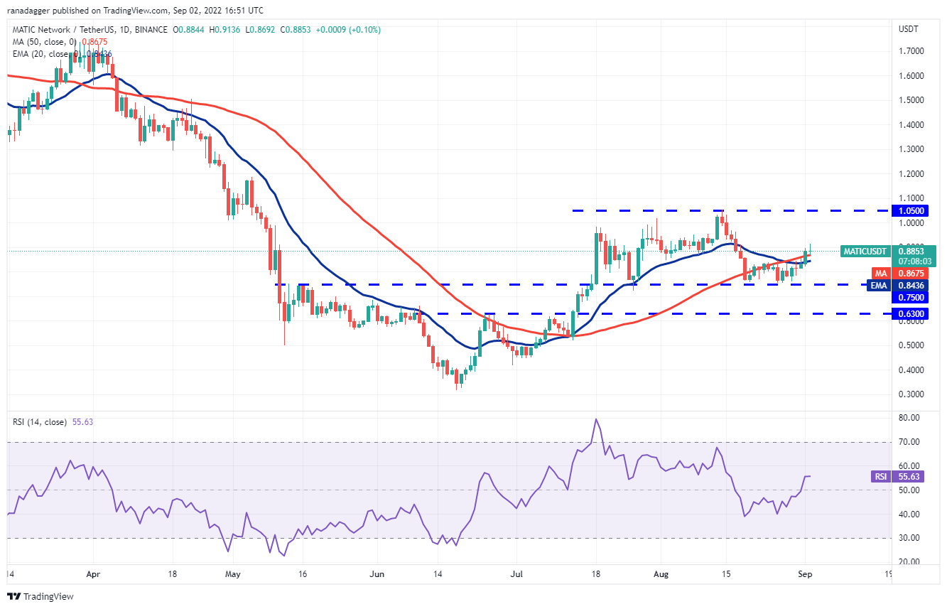 O Polygon (MATIC) rompeu e fechou acima das médias móveis em 1º de setembro. Isso abre as portas para uma possível recuperação da resistência aérea em US$ 1,05. Os ursos provavelmente defenderão esse nível agressivamente.