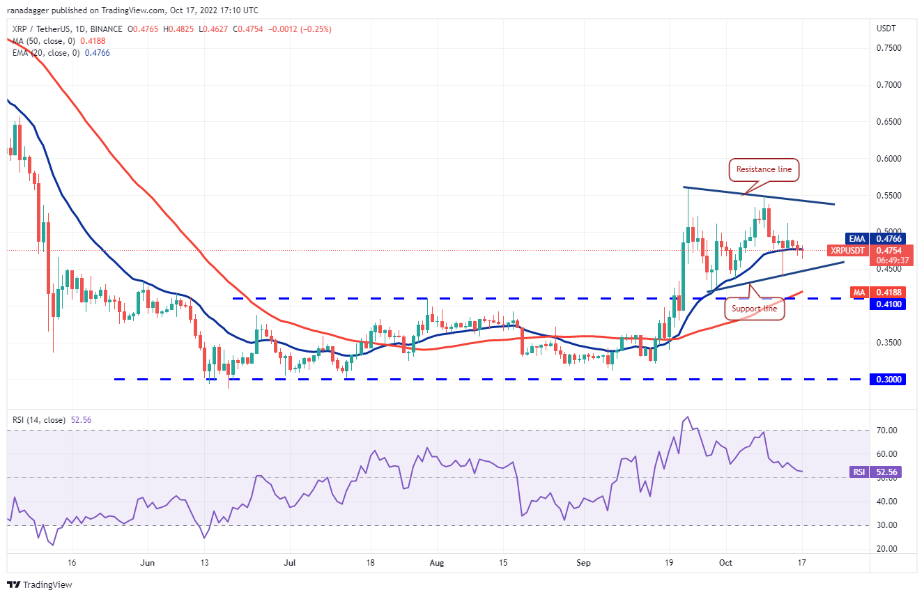 Se o preço se mantiver abaixo da EMA de 20 dias (US$ 0,47), o par XRP/USDT poderá deslizar para a linha de suporte do triângulo. Este nível pode atrair compradores e uma forte recuperação sugere que o par pode continuar a ser negociado dentro do triângulo. Por outro lado, um rompimento abaixo da linha de suporte pode afundar o par para US$ 0,41.