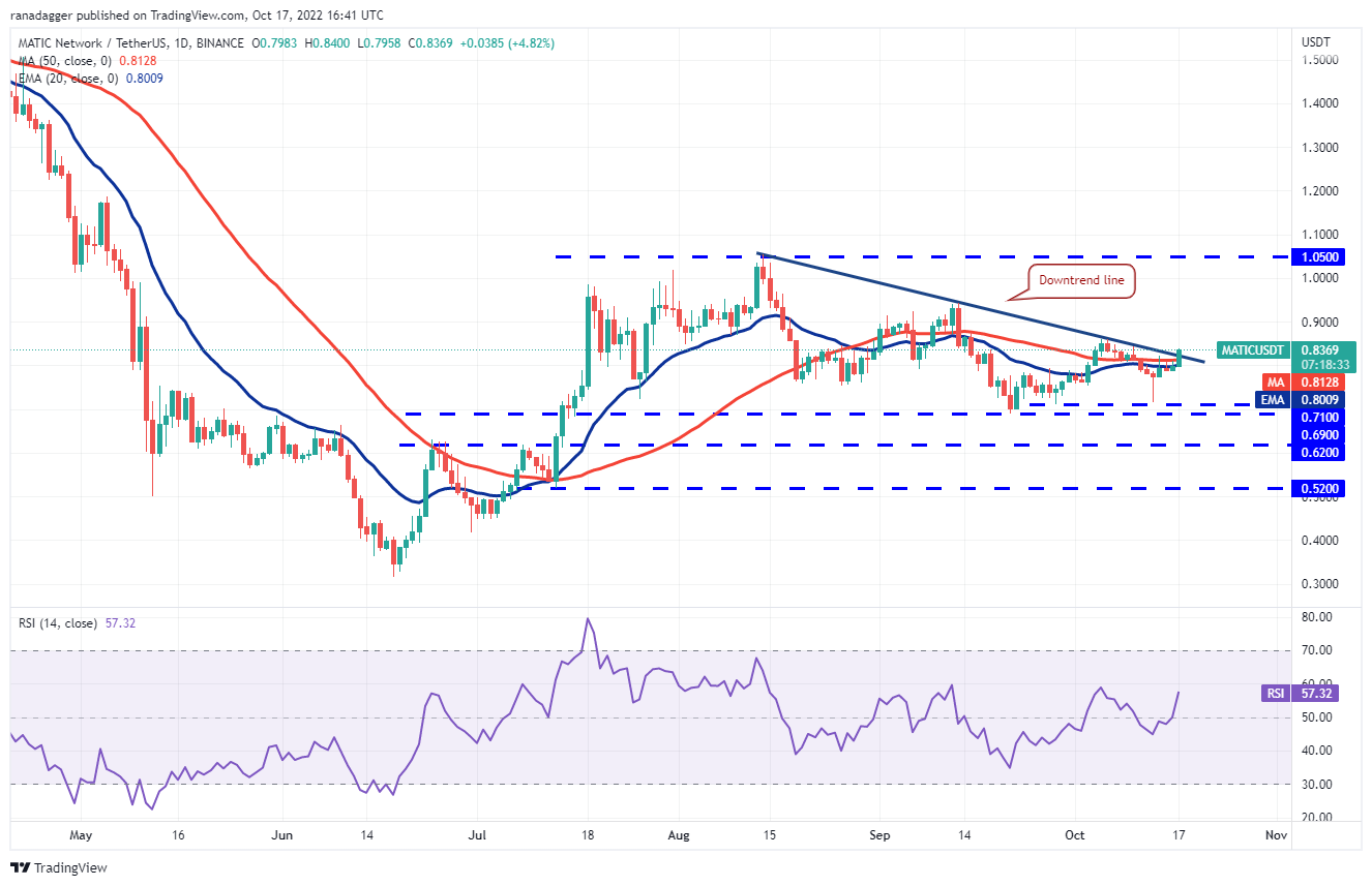 O par MATIC/USDT pode subir primeiro para US$ 0,86 e, se esse nível for ultrapassado, o rali de alívio pode chegar a US$ 0,94. Embora as médias móveis achatadas sugiram um equilíbrio entre oferta e demanda, o RSI no território positivo sugere que o momento pode estar girando a favor dos touros.