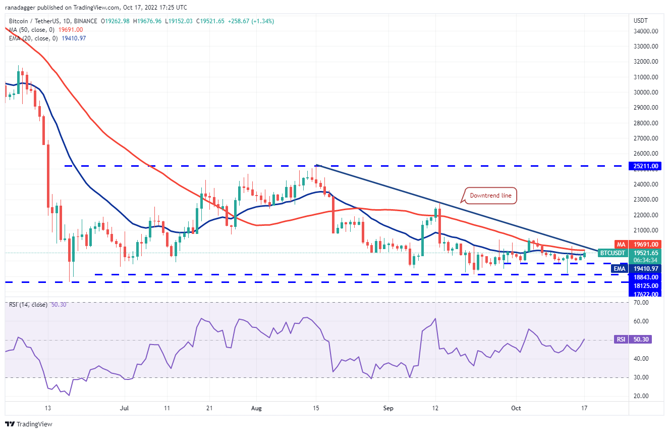 O Bitcoin rompeu acima da média móvel exponencial de 20 dias (US$ 19.410) em 17 de outubro e os touros estão tentando estender a recuperação acima da zona entre a média móvel simples de 50 dias (US$ 19.691) e a linha de tendência de baixa.
