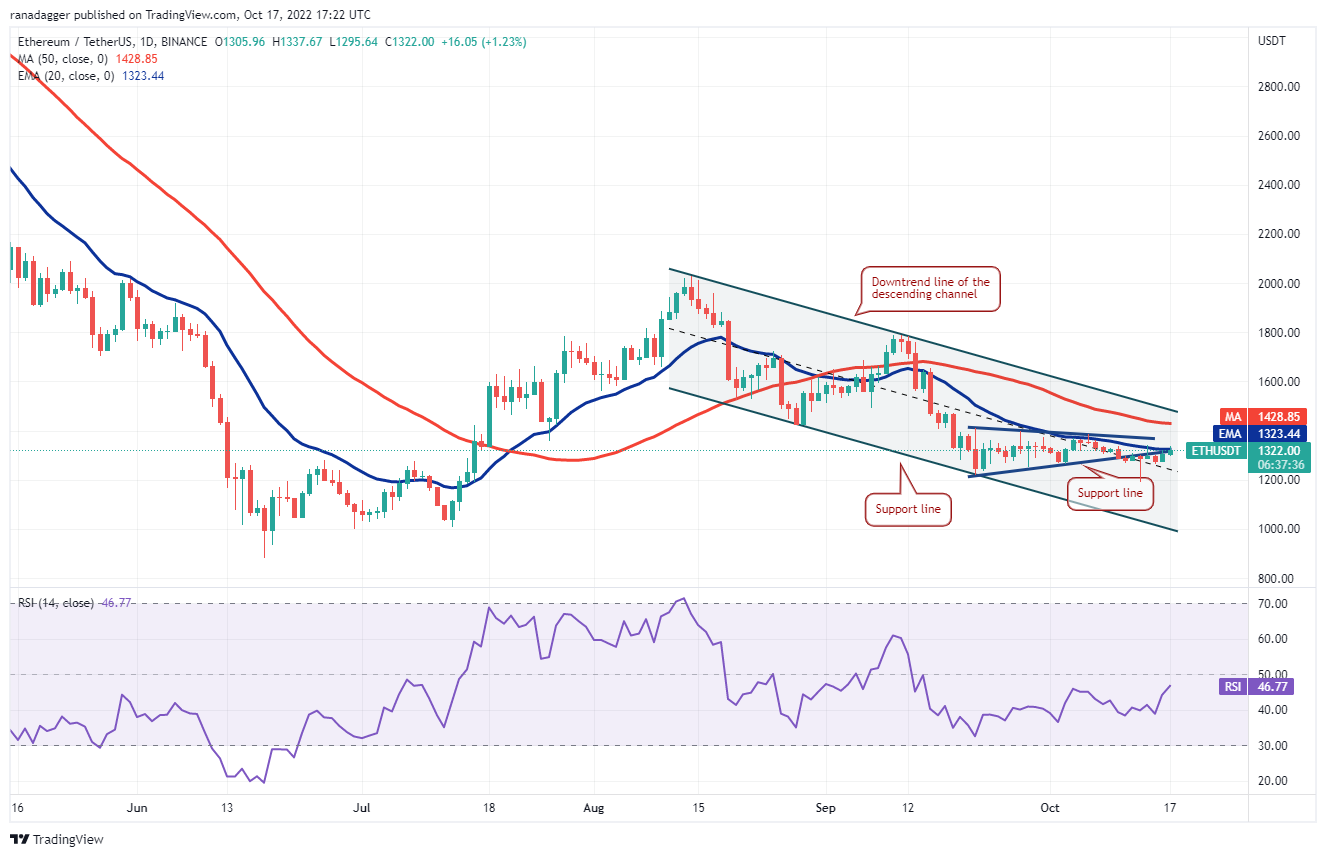 A recuperação do Ether (ETH) atingiu o nível de rompimento do triângulo. A EMA de 20 dias (US $ 1.323) está localizada perto desse nível, portanto, espera-se que os ursos defendam o nível agressivamente.