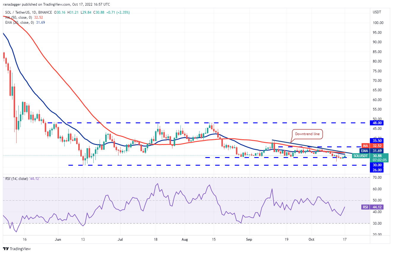 Solana (SOL) caiu e fechou abaixo do suporte de US$ 30 em 15 de outubro, mas os ursos não puderam capitalizar essa fraqueza. Isso sugere que as vendas secam em níveis mais baixos.