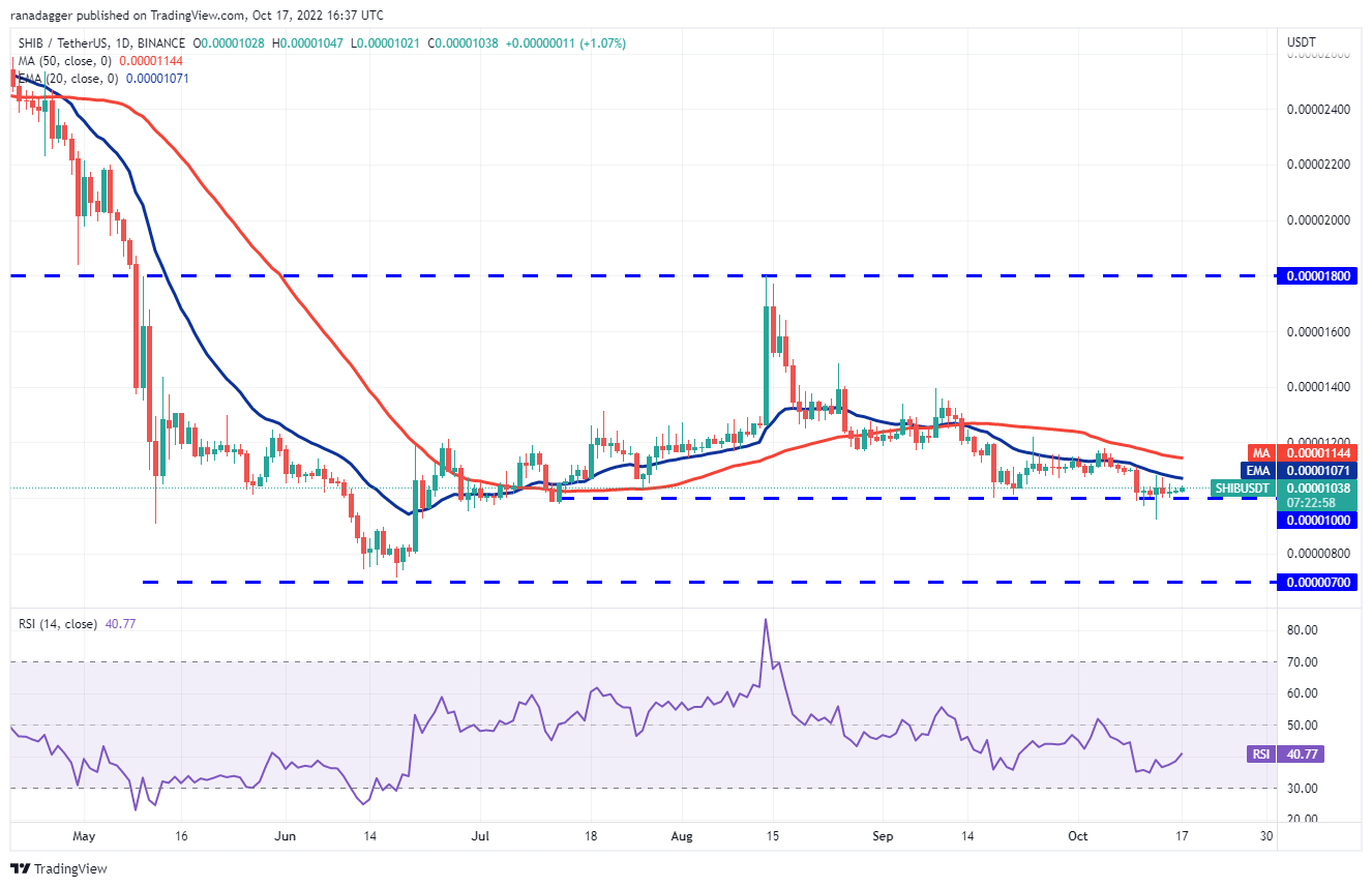 Ambas as médias móveis estão caindo e o RSI está no território negativo, indicando vantagem para os vendedores. Se o preço cair do nível atual ou das médias móveis, os ursos tentarão novamente afundar o par SHIB/USDT abaixo de US$ 0,000010. Se eles conseguirem fazer isso, a venda pode se intensificar e o par pode cair em direção ao suporte vital em US$ 0,000007.