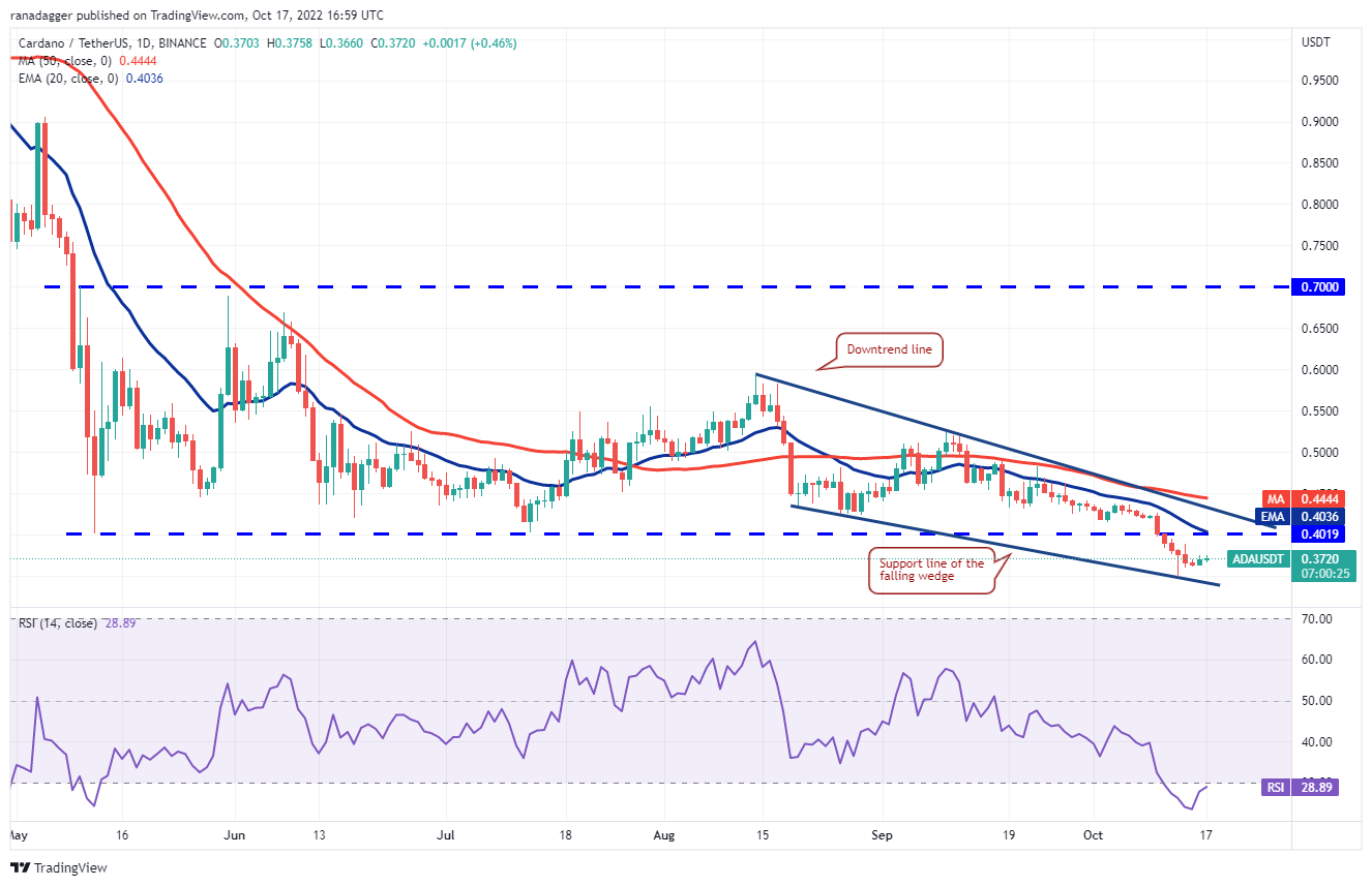 Cardano (ADA) formou um padrão de cunha descendente. O preço saltou da linha de suporte da cunha em 13 de outubro e os touros estão tentando empurrar o preço para a EMA de 20 dias (US$ 0,40).