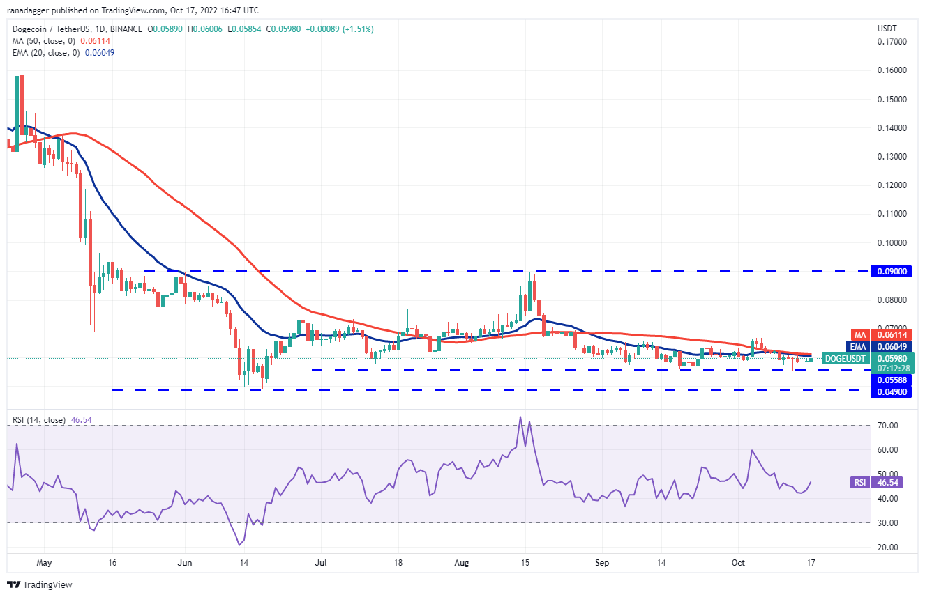 Se o preço cair de US$ 0,07, o par DOGE/USDT poderá cair novamente para o suporte perto de US$ 0,06. Isso poderia manter o par preso entre esses dois níveis por mais alguns dias. O achatamento da EMA de 20 dias (US$ 0,06) e o RSI logo abaixo do ponto médio sugerem uma consolidação no curto prazo.