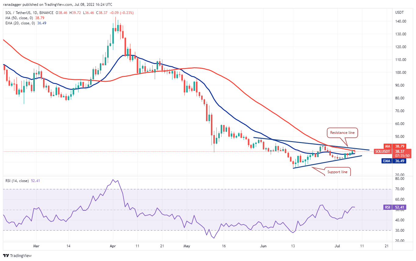 Os compradores tentaram empurrar a Solana (SOL) acima da SMA de 50 dias (US$ 38,79) em 5 e 6 de julho, mas não conseguiram superar a barreira. Isto sugere que os ursos estão vendendo em altas.