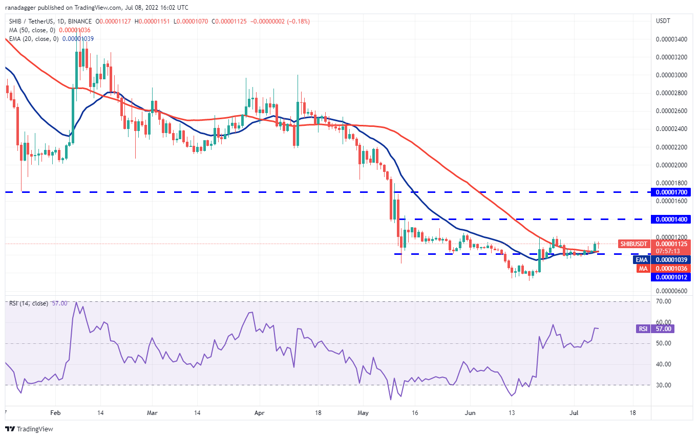 A negociação de curto alcance em Shiba Inu (SHIB) resolveu para cima em 7 de julho, quando o preço rompeu acima da resistência imediata em US$ 0,000011. Os ursos tentaram baixar o preço abaixo de US$ 0,000011 em 8 de julho, mas a cauda longa no candle indica uma forte compra em quedas.
